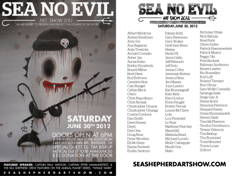 I am pleased to officially announce that I will once again be participating in this year’s annual Sea No Evil Art Show, taking place Saturday June 30th at the Riverside Municipal Auditorium. Last year’s event was such an amazing success for the Sea Shepherd Conservation Society and was also huge achievement for myself; the two original pieces of artwork I donated to SNE 2011 both sold. This year I will be donating one new piece that is a part of my most recent body of work.
