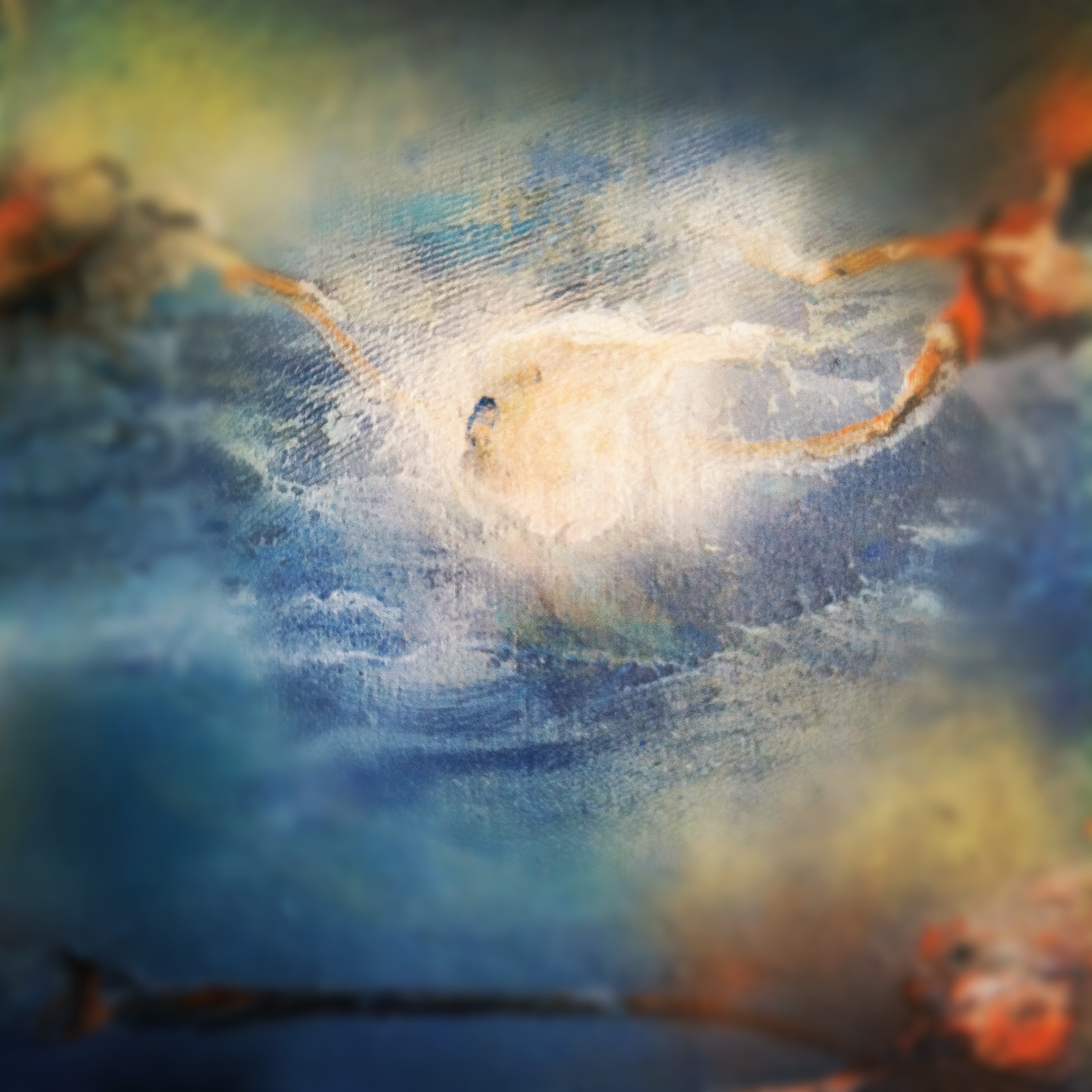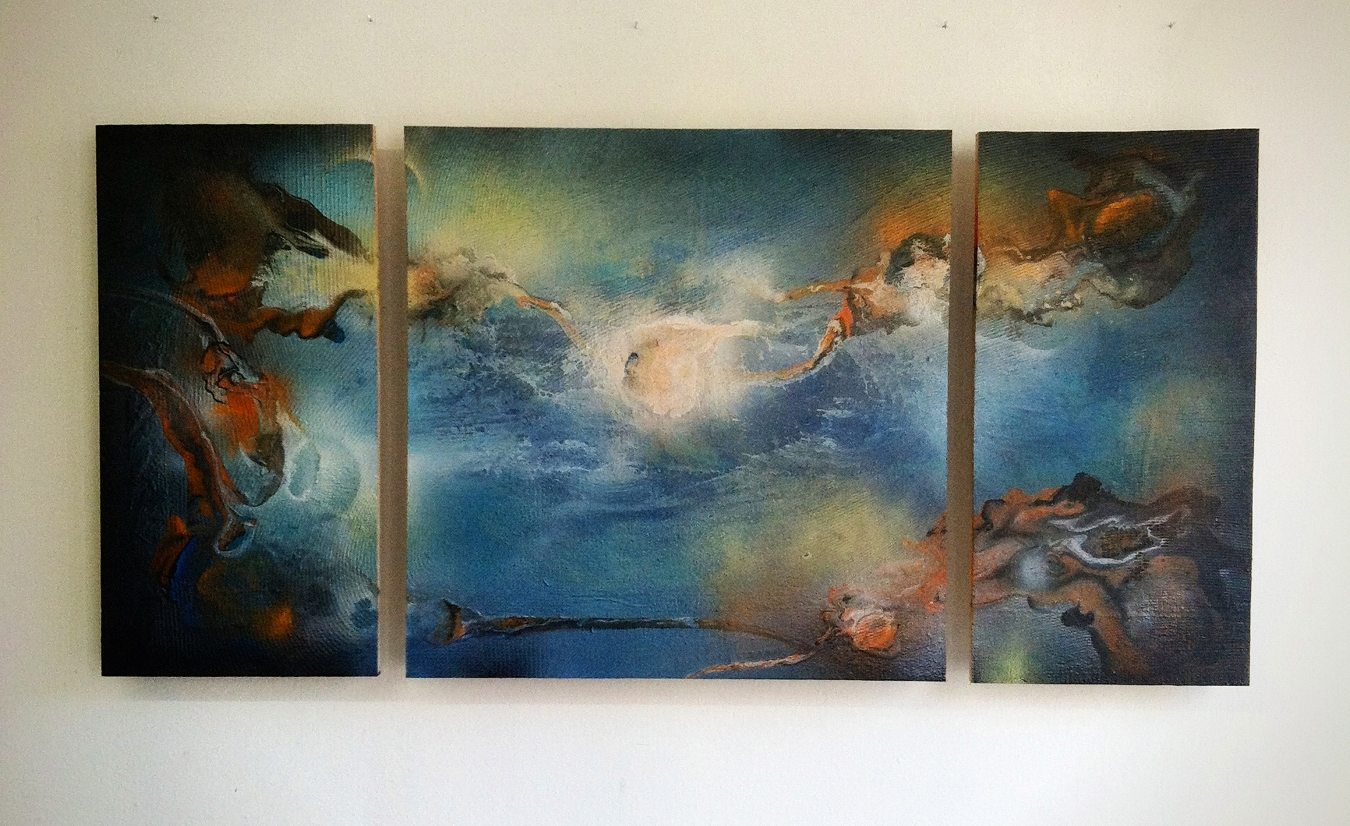 Gesso, bucket paint, acrylic and spray paint, epoxy resin coat on wood panel