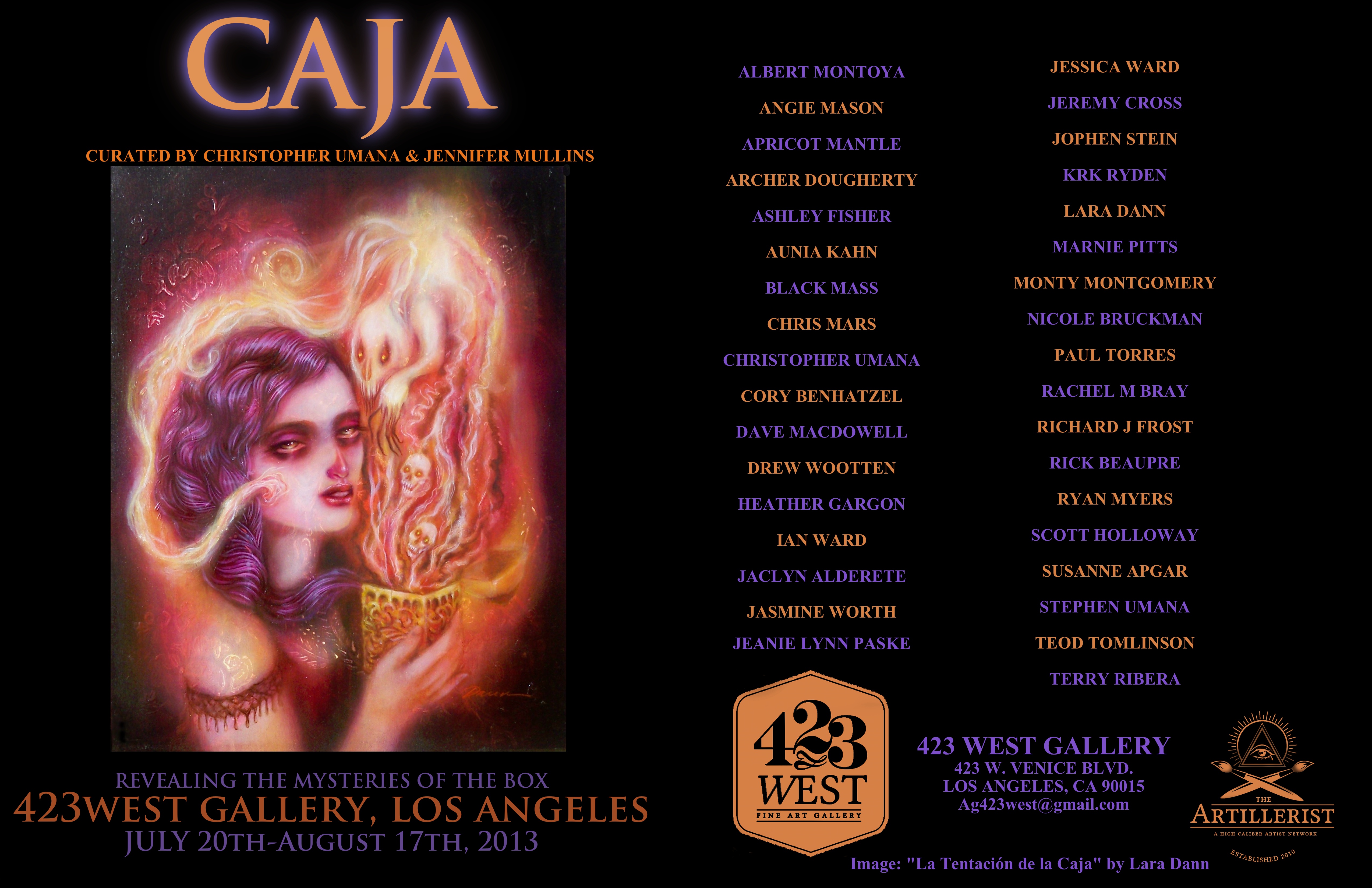 Over the past couple of years while showing in the Sea No Evil Art Show I’ve had the opportunity to show along side and meet some incredibly talented and well known artists. I am very thankful for that. Recently I was asked if I wanted to be a part of an upcoming group show to be curated by an artist colleague I have exhibited with at SNE, Christopher Umana. Of course I said yes and was honored to have been sought out for this new show, CAJA to take place 7-27-2013 at 423West Gallery in Los Angeles. Though I have yet to meet Christopher in person his work stands out to me as being very original and inspiring. This show has also given me the chance to be able to occupy wall space with one of my long time friends, fellow artist and, someone who has continued to amaze and inspire me, Jophen Stein.